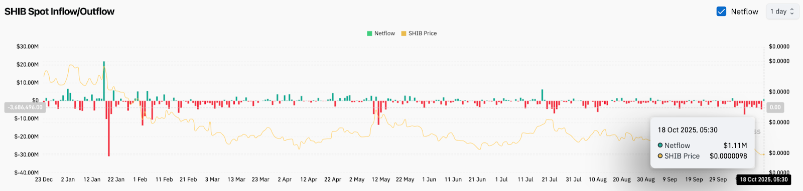 Fresh data shows improving investor activity. SHIB recorded a $1.11 million net inflow on October 18, marking its first positive flow in weeks. Though modest, this shift reflects cautious accumulation by spot buyers after a period of persistent outflows.