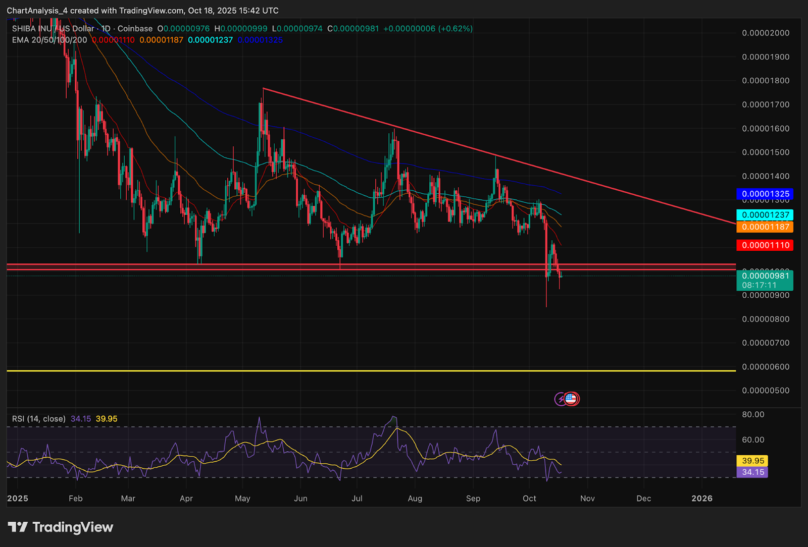 Shiba Inu price is stabilizing around $0.0000098 after last week’s sharp drop to multi-month lows. The token has held the crucial $0.0000090–$0.0000092 demand zone, where prior liquidity and long-term buyers have repeatedly stepped in.