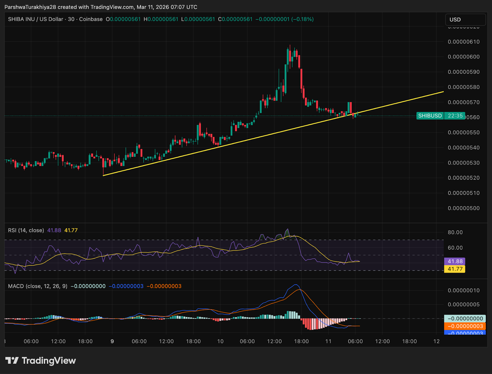 • Shiba Inu trades at $0.00000562, down 0.53%, pressing against a rising trendline on the 30-minute chart as RSI holds at 43.17.