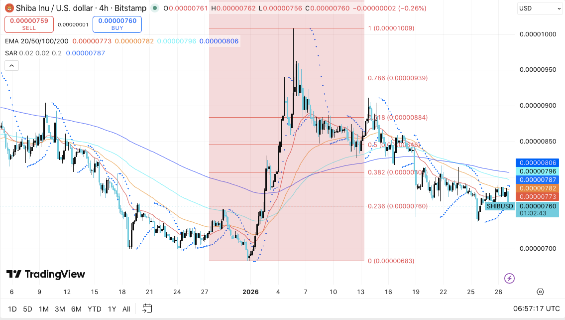 SHIB trades below its 20, 50, 100, and 200-period EMAs on the 4-hour chart. This alignment reflects sustained downside pressure. Moreover, each rebound has stalled near the EMA cluster, reinforcing seller dominance. Parabolic SAR signals also favor the downside, as dots continue to print above price.