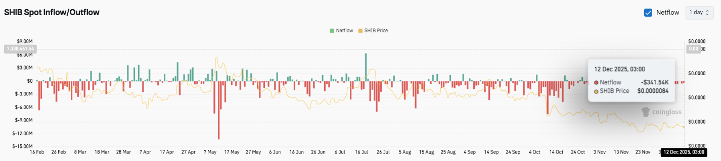 Spot market data aligns with this defensive stance. SHIB has recorded persistent net outflows throughout the year. Larger outflow bars appeared during several price declines, including recent sessions.