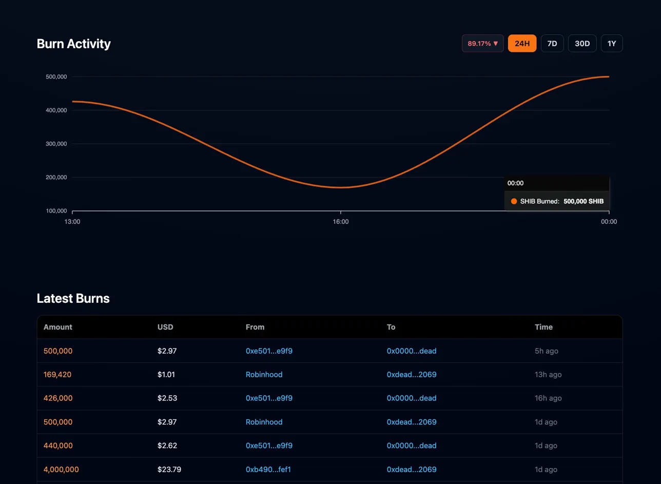 The 24h burn rate fell 89.17% with burn activity dropping sharply through the afternoon before recovering toward 500,000 SHIB per hour by midnight.