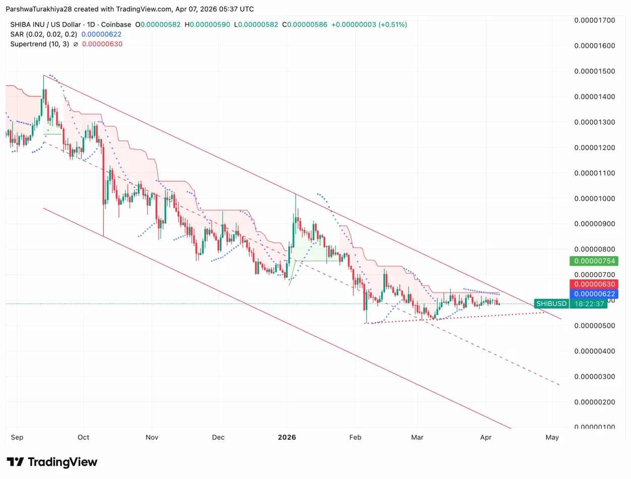 The SAR at $0.0000622 and Supertrend at $0.0000630 are sitting just above current price and converging, forming a tight resistance cluster that every rally attempt has failed to clear since October. A daily close above $0.0000630 would flip both indicators simultaneously and mark the first structural shift in the daily trend since the channel began. Below, the channel’s lower boundary near $0.0000500 is the floor that matters through the rest of April.
