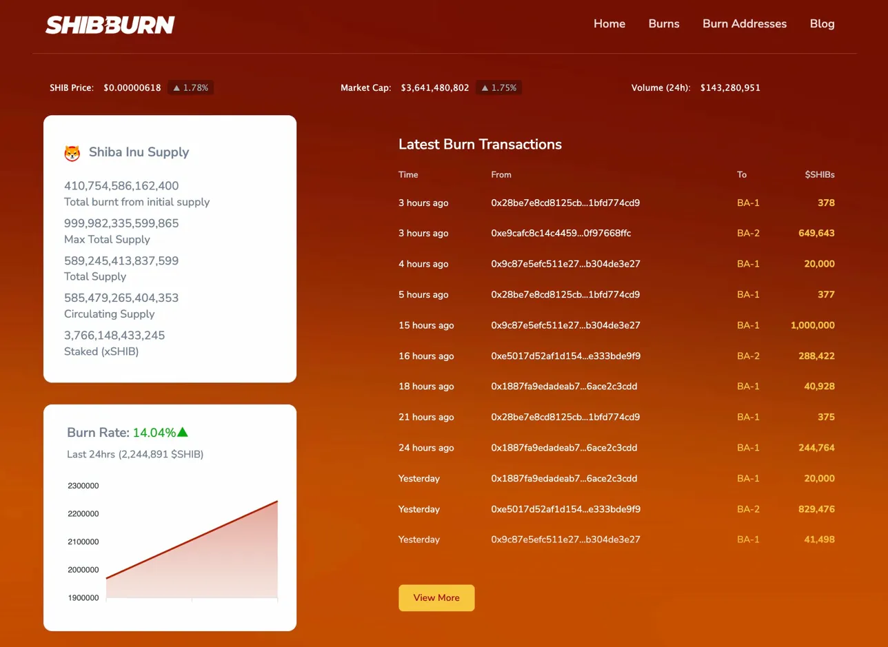 The burn rate hit 14.04% in the last 24 hours, with 2,244,891 SHIB burned. Over 410.75 trillion SHIB has been removed from the initial supply since launch, leaving a circulating supply of 585.47 trillion. The largest single burn in the recent log was 1,000,000 SHIB sent to the dead address 15 hours ago, with a 649,643 SHIB transaction following shortly after.