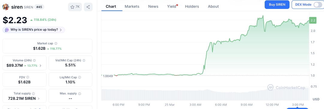Market metrics aligned with the price movement. SIREN’s market capitalization rose to $1.62 billion, marking a 118.77% increase. At the same time, 24-hour trading volume reached $89.37 million, up 13.77%.