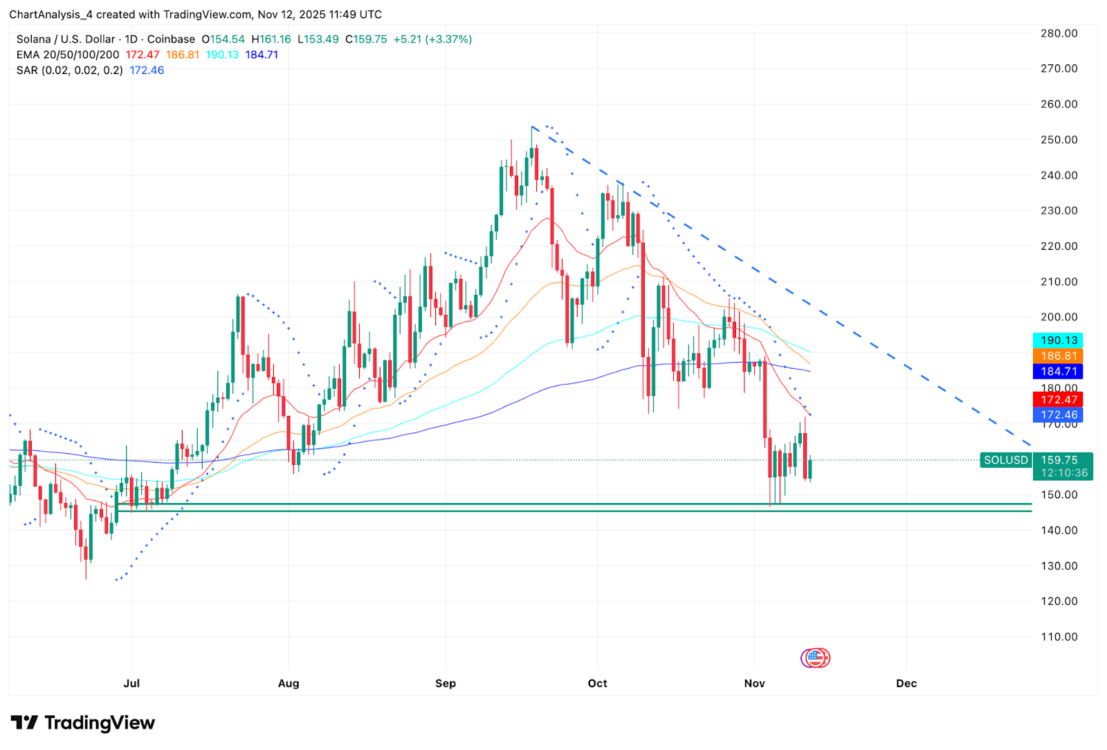 On the daily chart, Solana remains within a descending channel since the September peak near $275. Price recently rebounded from the horizontal support region between $148 and $152, where previous consolidations triggered strong upward reversals.
