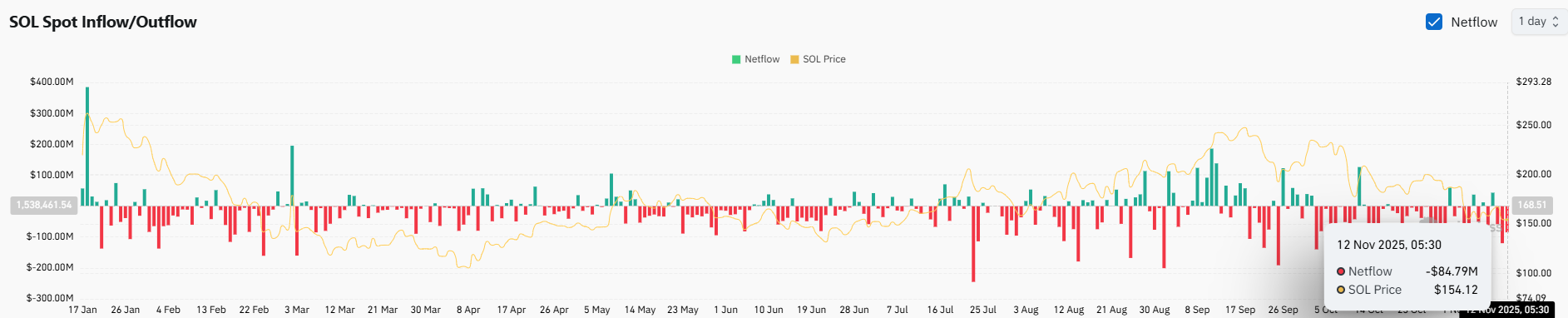 According to Coinglass, Solana recorded $24.6 million in net outflows on November 12, marking the smallest single-day outflow in over two weeks. The moderation signals that selling pressure may be easing, though inflows have yet to return consistently.