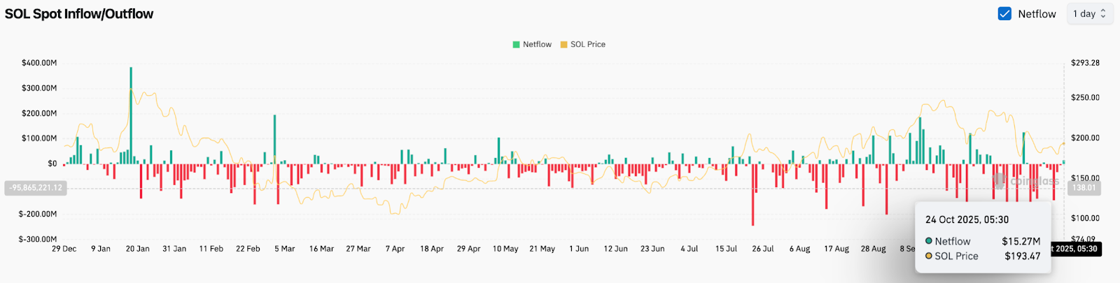 On-chain data reveals a nuanced backdrop for Solana price action. Exchange flow data shows $15.27 million in net inflows on October 24, hinting at renewed accumulation. Yet, the broader picture reflects weeks of persistent outflows, which have pressured Solana price volatility throughout October.