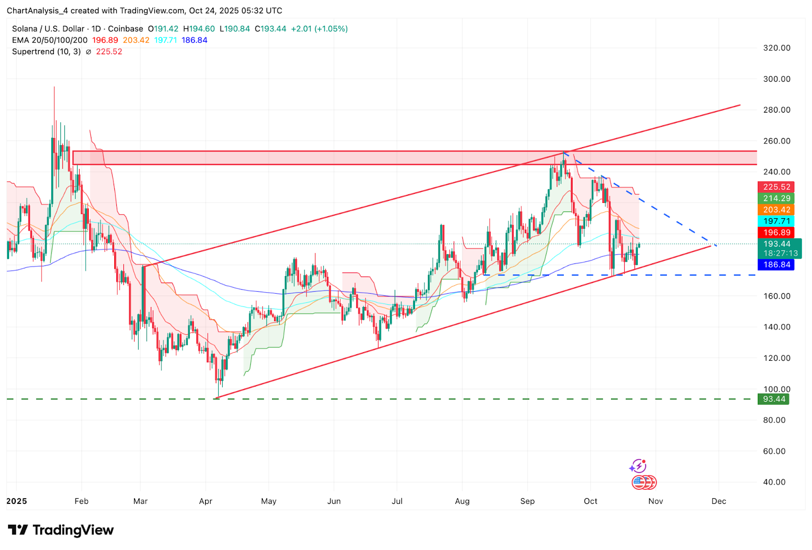 The daily chart highlights Solana price action consolidating within a long-term ascending channel. Price has recently tested the $186 zone, where the 200-day EMA provides structural support. The $196–$198 range, defined by the 20-day EMA and short-term cluster, now acts as an immediate pivot.