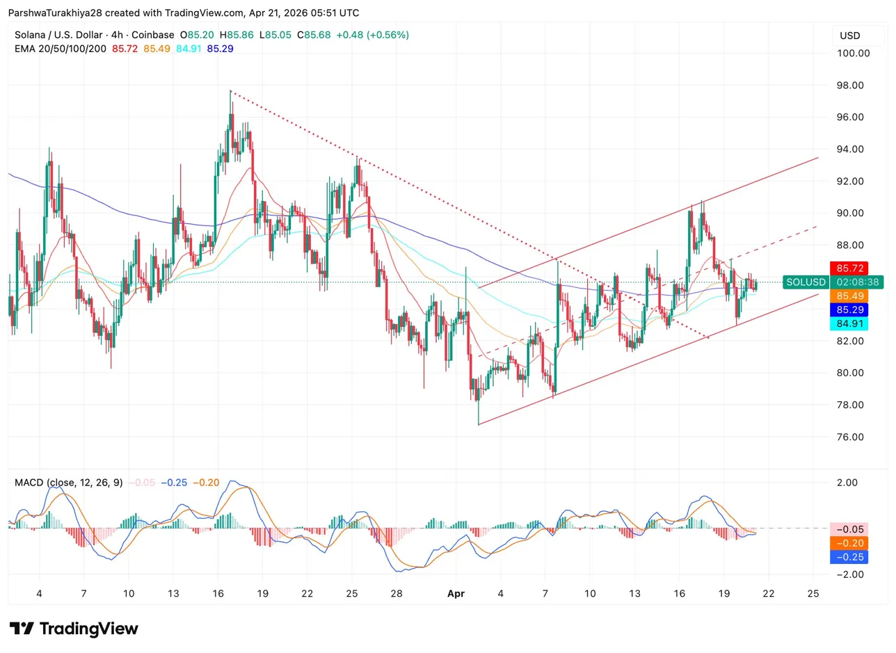 SOL trades at $85.68 on April 21, sitting on top of four compressed EMAs inside a 4H ascending wedge while the Solana Foundation president argues unified liquidity for 5.5 billion internet users makes Solana the only architecture that matters.