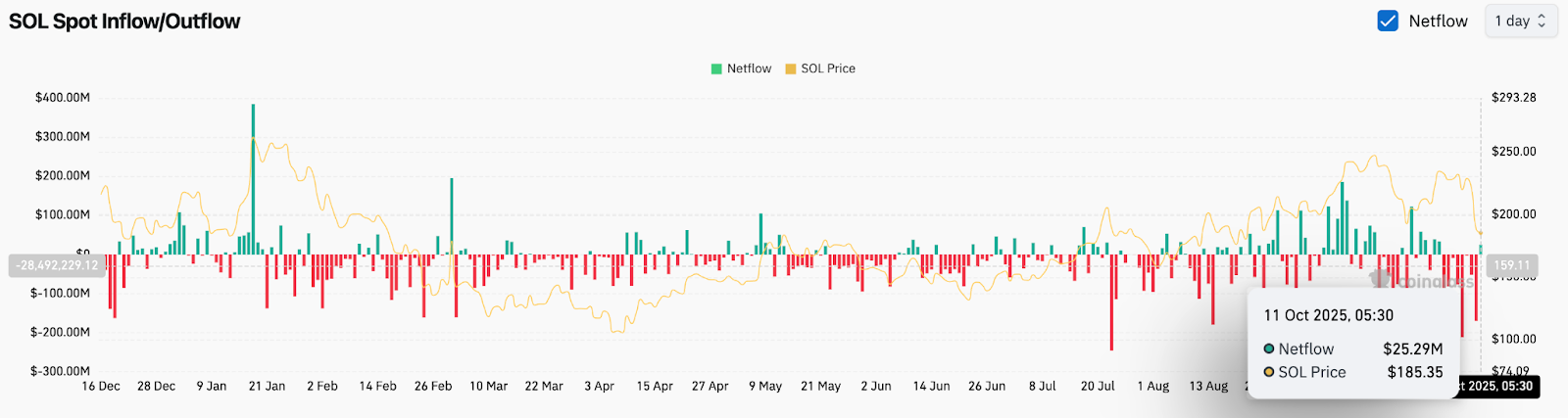 Coinglass data shows Solana recorded a $25.29 million net inflow on October 11, a notable shift from the previous week’s persistent outflows. This indicates that spot buyers are stepping back in at discounted prices.
