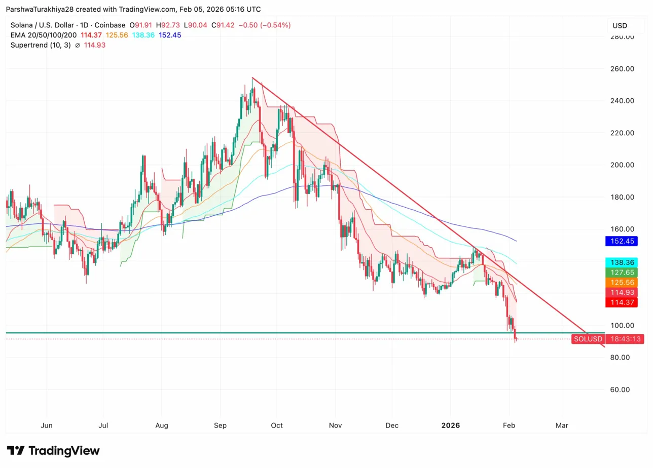 Solana price today trades near $91.42 after breaking below the psychological $100 level for the first time since July 2025. The move represents a 65 percent decline from September highs near $260 and confirms a structural breakdown on the weekly timeframe that puts significantly lower levels in play.