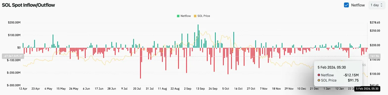 Coinglass data shows $12.15 million in spot outflows on February 5, continuing the distribution pattern that has persisted through the selloff. While the outflow magnitude is smaller than recent peak days, the direction remains negative.