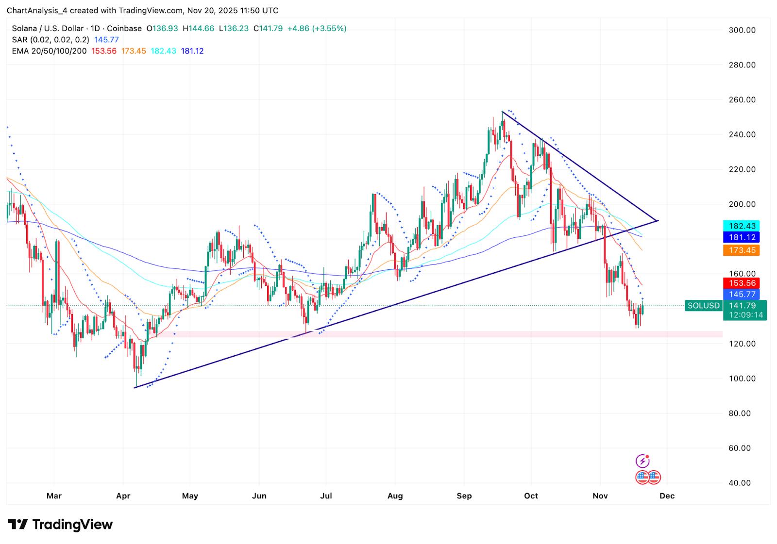 The daily chart shows a clear structural change. Solana broke decisively below the rising trendline that carried price from April to October. Once the breakdown occurred, the retest near $160 failed, and price rolled over into the current support area.