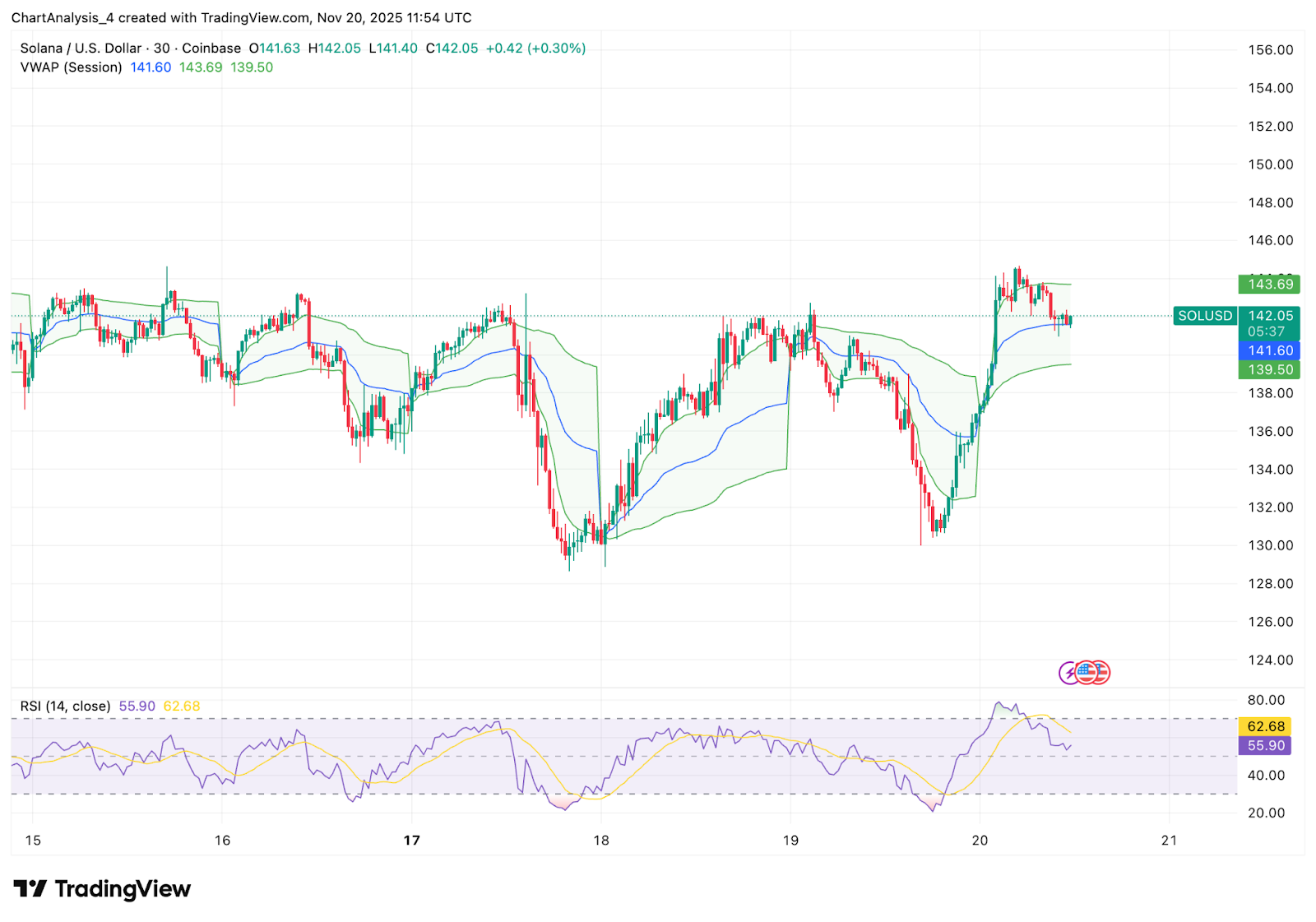 Shorter timeframe charts show early signs of stabilization. Solana trades above session VWAP near $141.60, with the upper VWAP band near $143.69 acting as intraday resistance. Price has struggled to clear this band, signaling hesitation from buyers despite the recovery attempt.