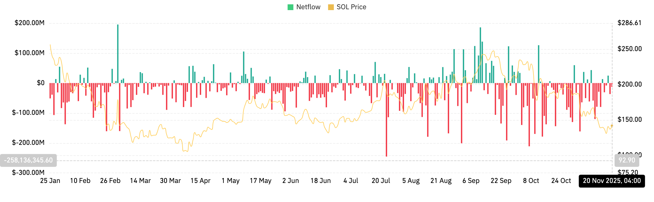 Coinglass spot flow data continues to signal distribution. Solana recorded $11.66M in net outflows on November 20, adding to a long series of negative days since early September.