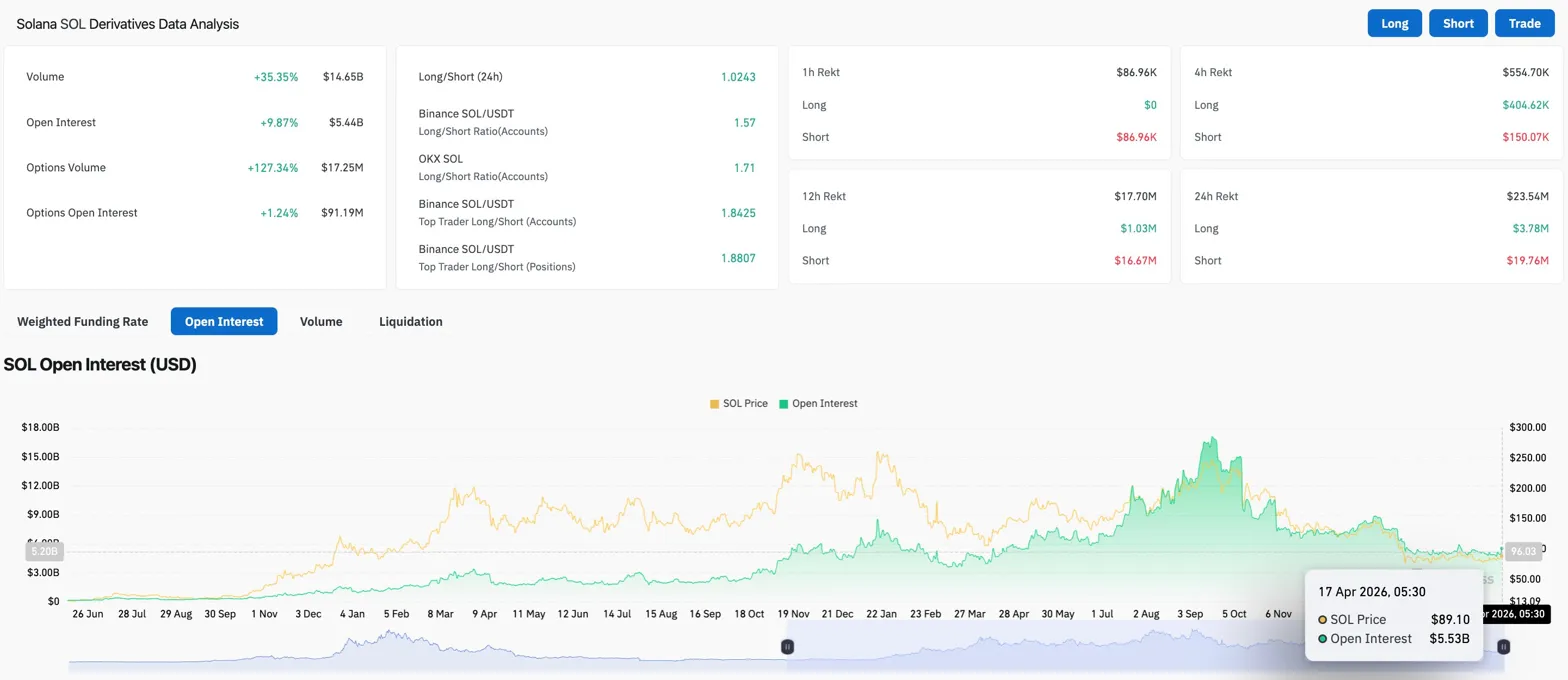 SOL trades at $88.15 on April 17, down 1%, as price presses into a key resistance cluster at $88.56 where the upper Bollinger Band meets a descending trendline. The move comes as wXRP brings over $100M in fresh liquidity to Solana, while derivatives activity picks up sharply around this level.