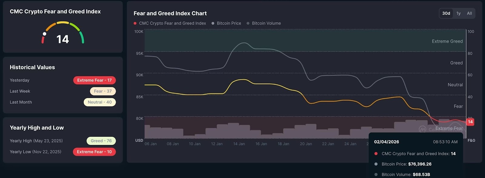 SOL has now declined about 23% over the past week and more than 50% on a yearly basis. Market sentiment remains fragile, with the crypto Fear and Greed Index reading 14 on Wednesday, a level that reflects intense risk aversion.