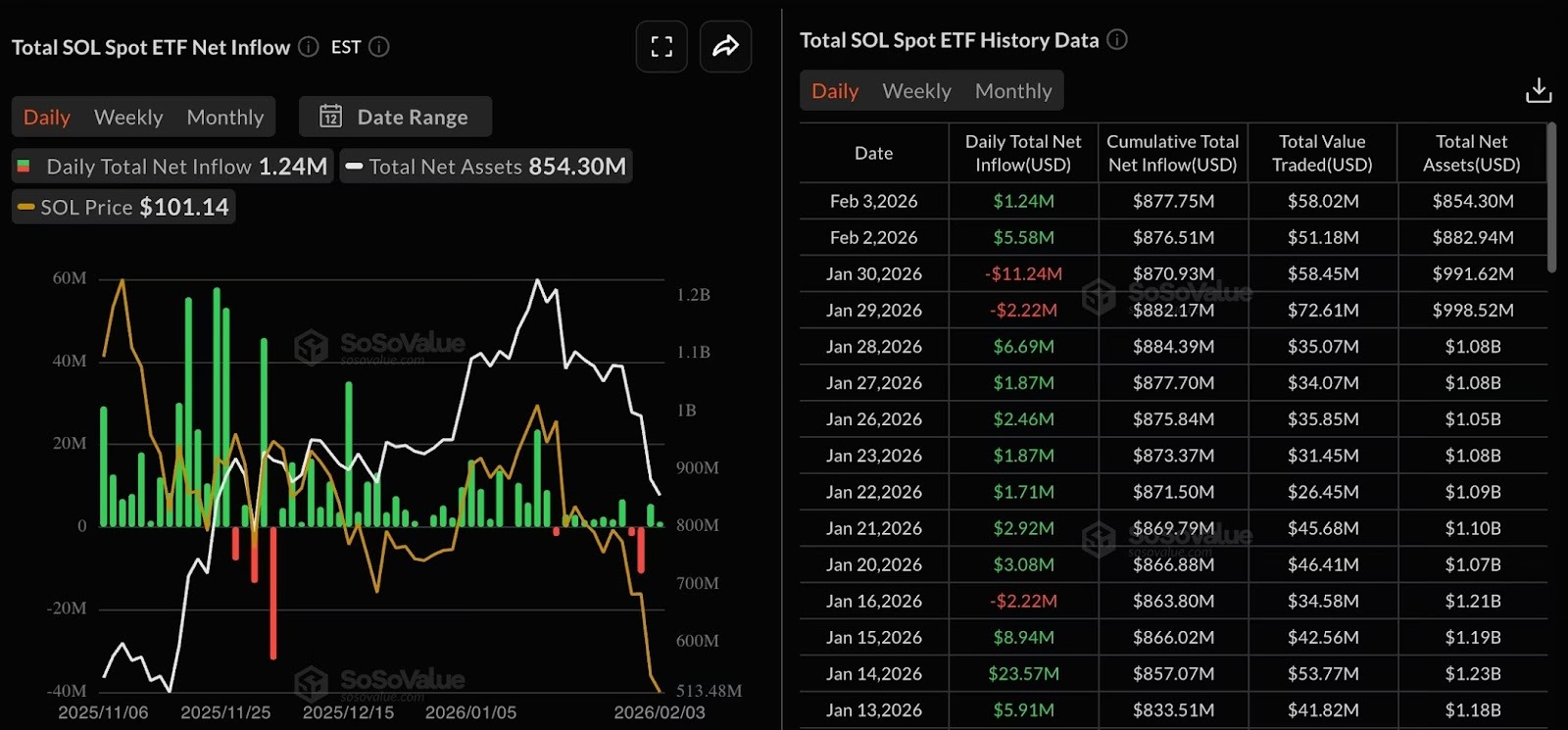 The Solana-focused exchange-traded funds posted a $1.24 million inflow on Tuesday, adding to a $5.58 million inflow on Monday. While positive, the figures remain modest relative to Solana’s market size and earlier periods of stronger demand.