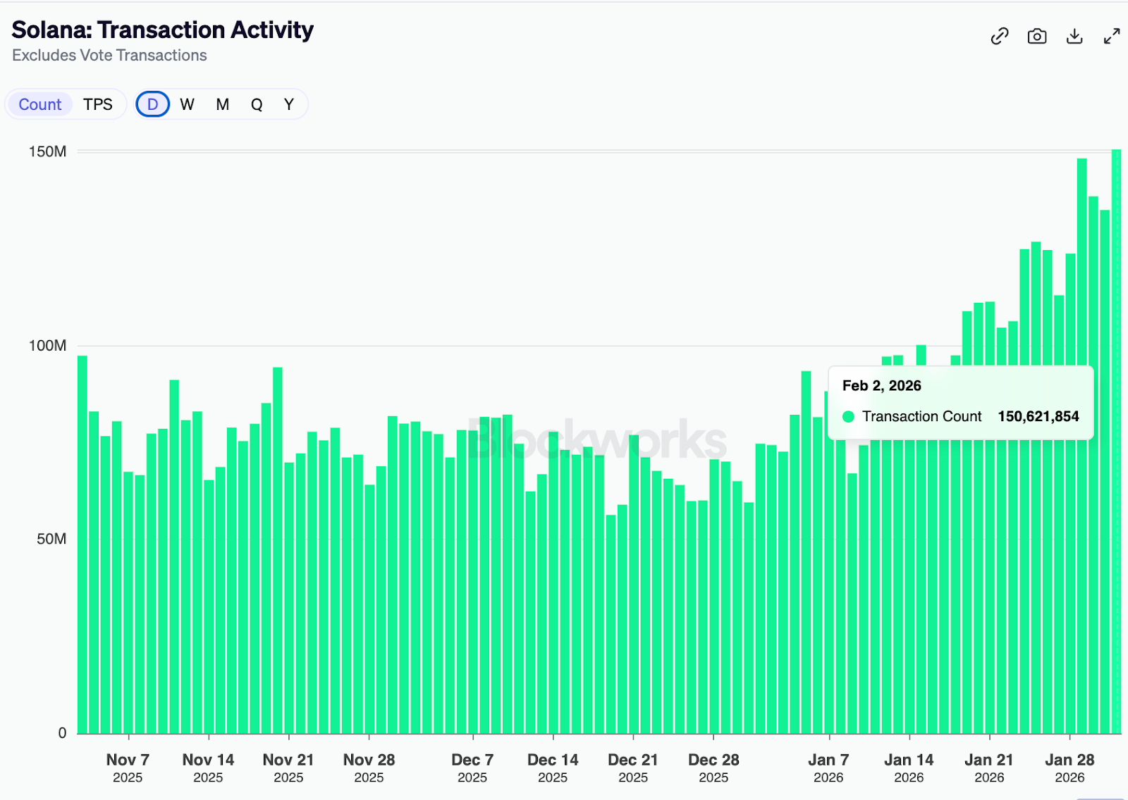 In contrast to price action, Solana’s network usage continues to expand. Blockworks data shows the blockchain processed around 150 million transactions on Tuesday, the highest daily total on record. Average throughput reached about 1,743 transactions per second.