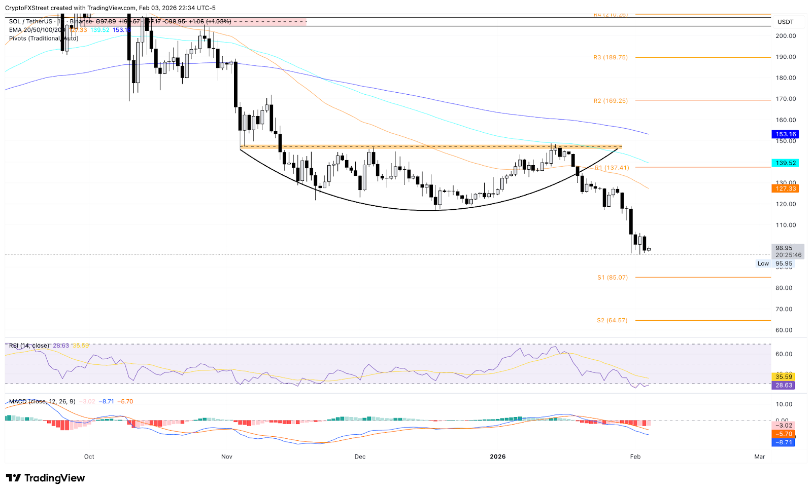 - Solana falls below $100 amid broad crypto market weakness and bearish derivatives signals.