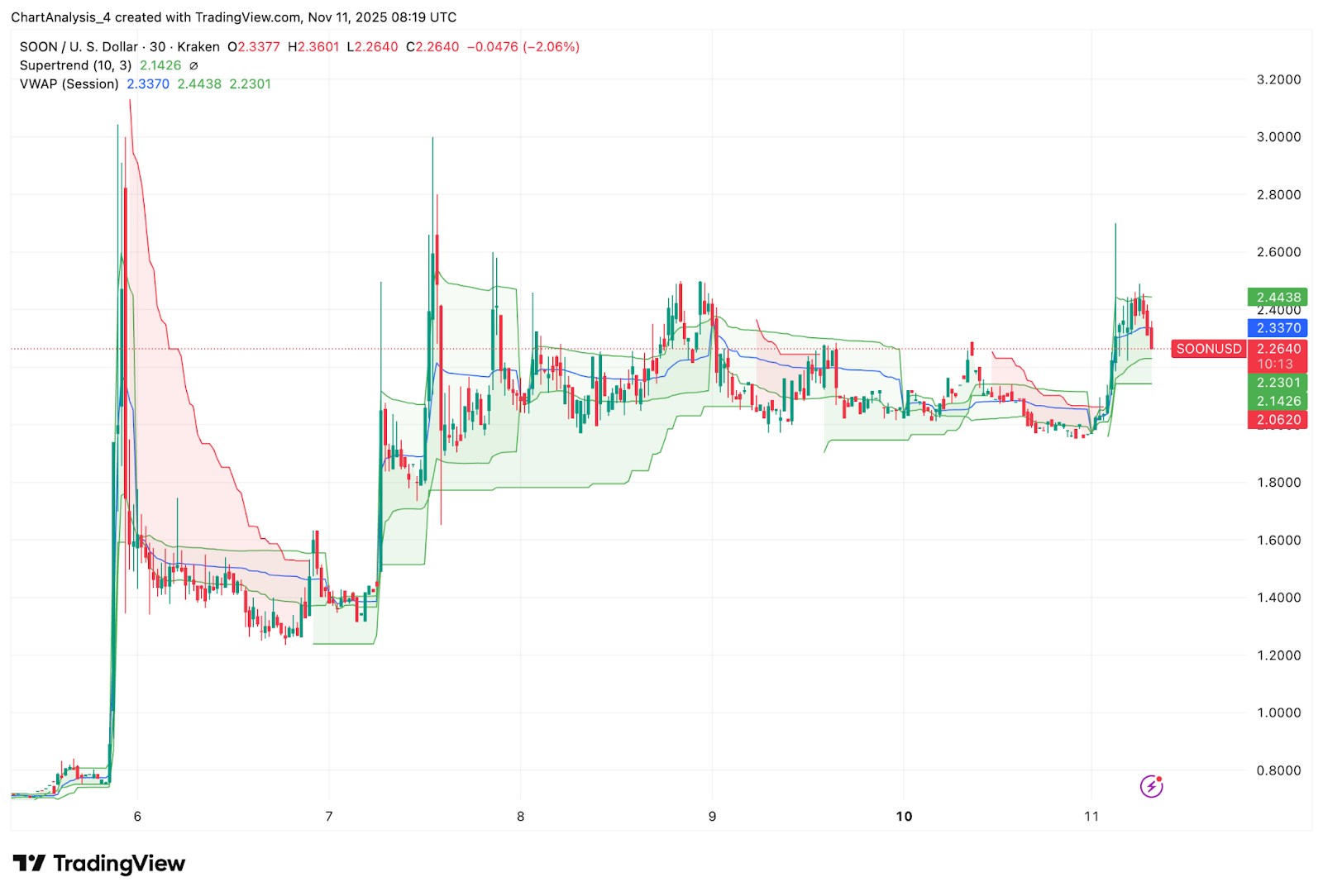 - Supertrend flipped bullish when SOON broke above $2.14 and remains green