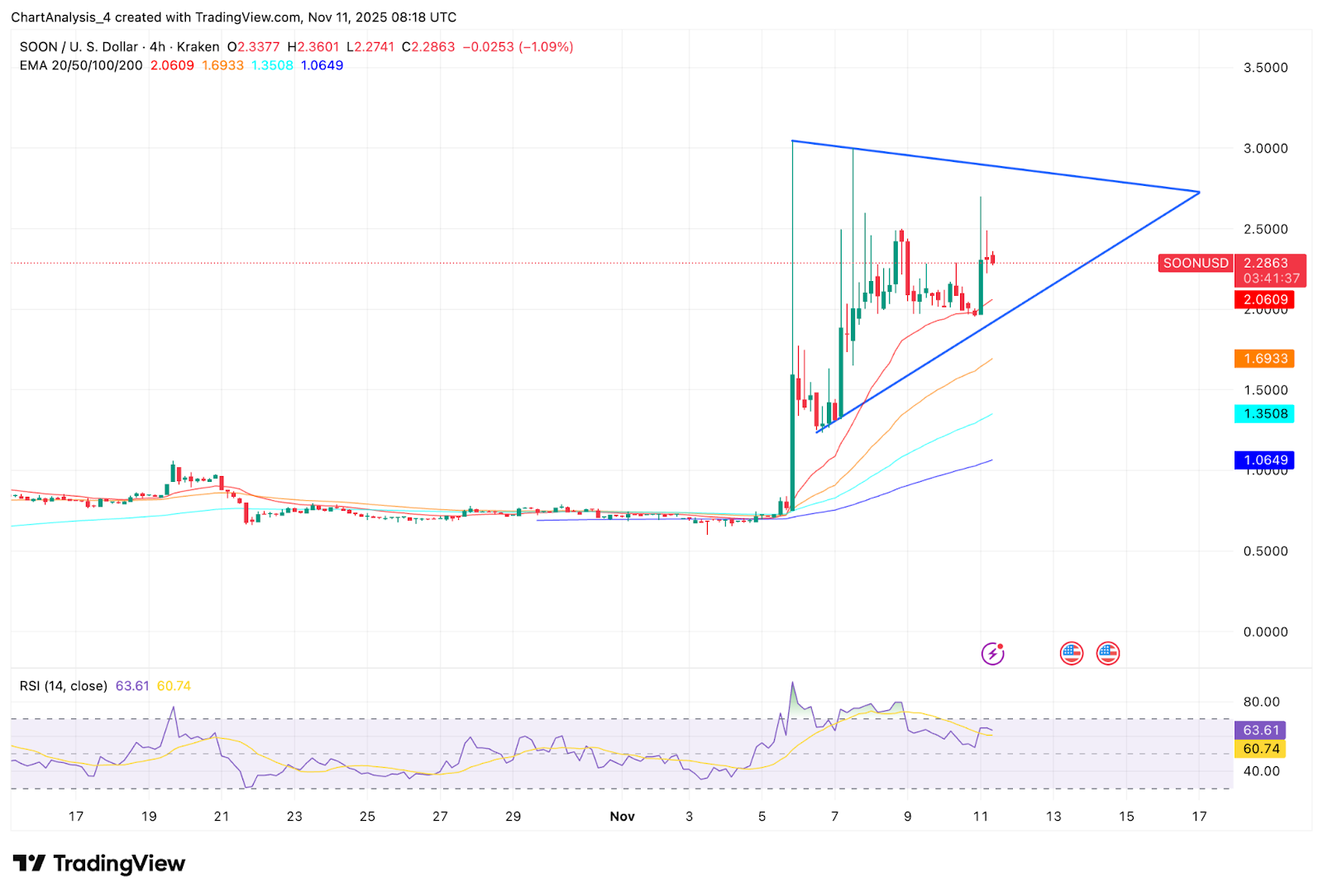SOON price today is trading near $2.28, consolidating after a vertical rally that sent the token up more than 200 percent in a week. Buyers continue defending higher lows, keeping SOON within a tightening symmetrical triangle. The next move depends on how price reacts at the rising trendline and the $2.60 ceiling.