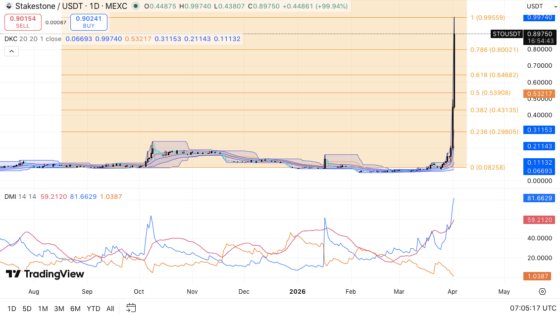 StakeStone (STO) extended its explosive rally this week, posting one of the strongest short-term gains in the market. The token surged to $0.9422, backed by over $1.12 billion in daily trading volume.