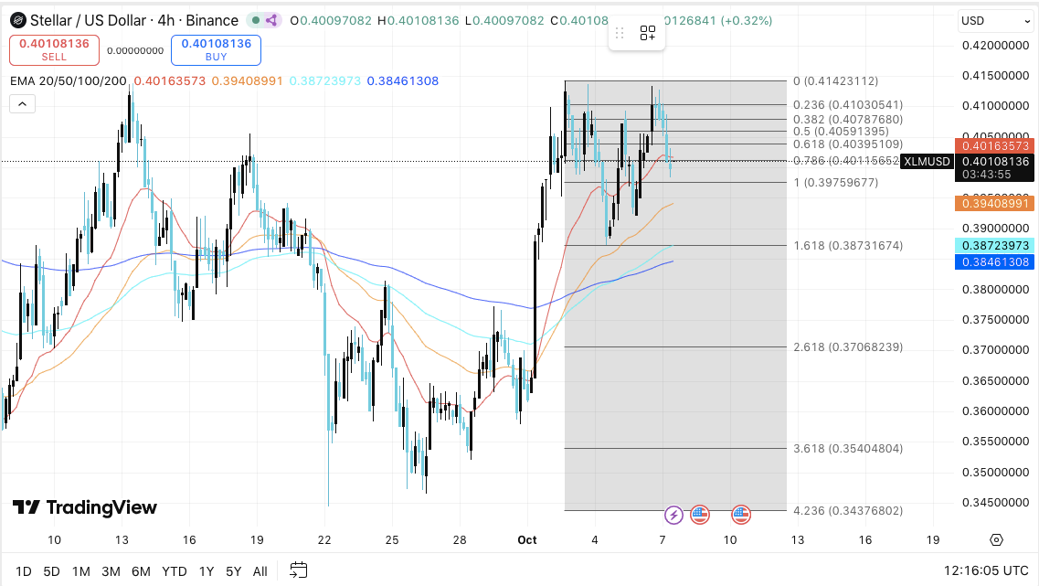 Key levels for Stellar (XLM) remain well-defined as consolidation continues around the $0.40 region heading into mid-October.