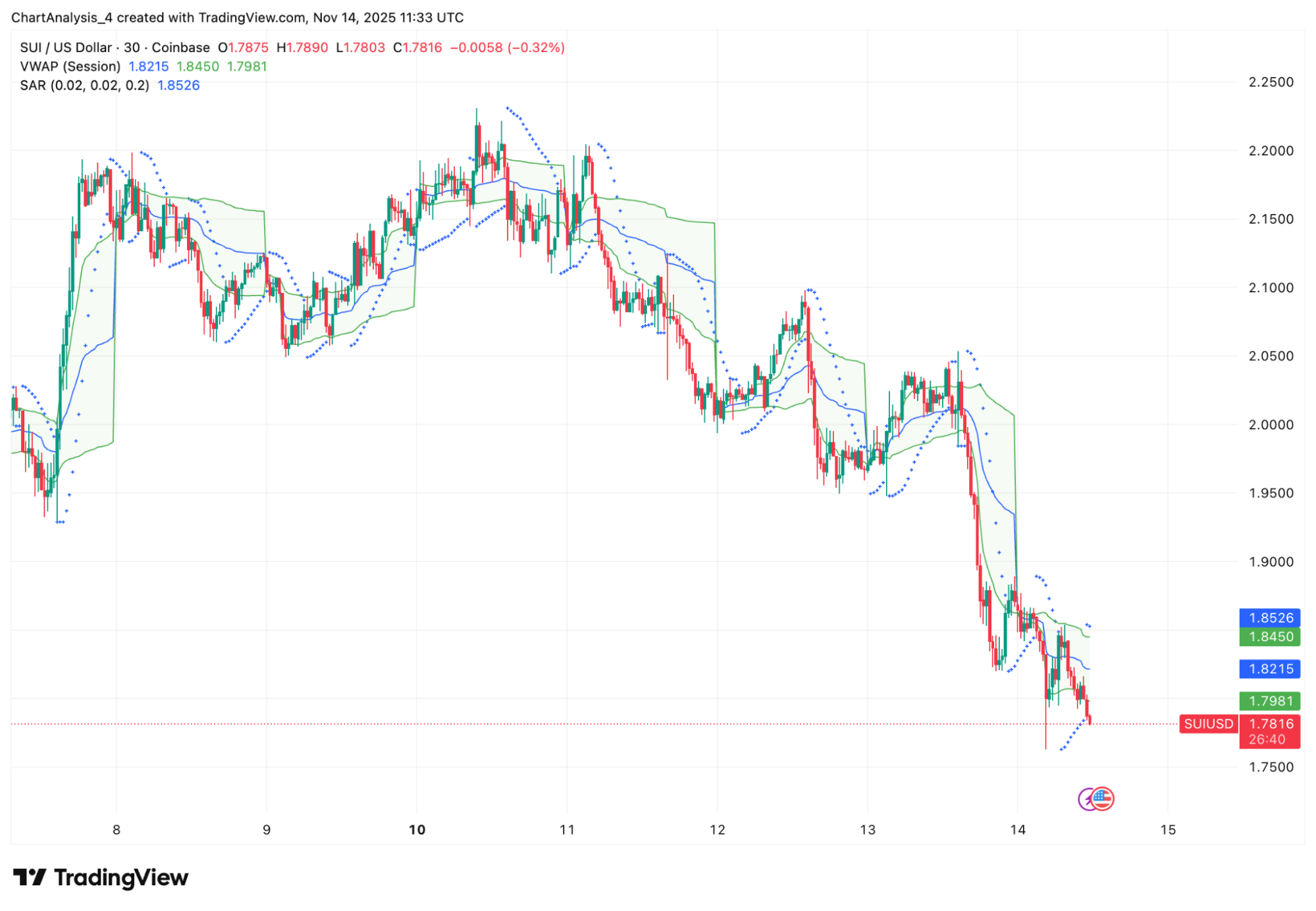 - SUI price today trades near $1.78, struggling after repeated rejections from the descending trendline and key EMAs.