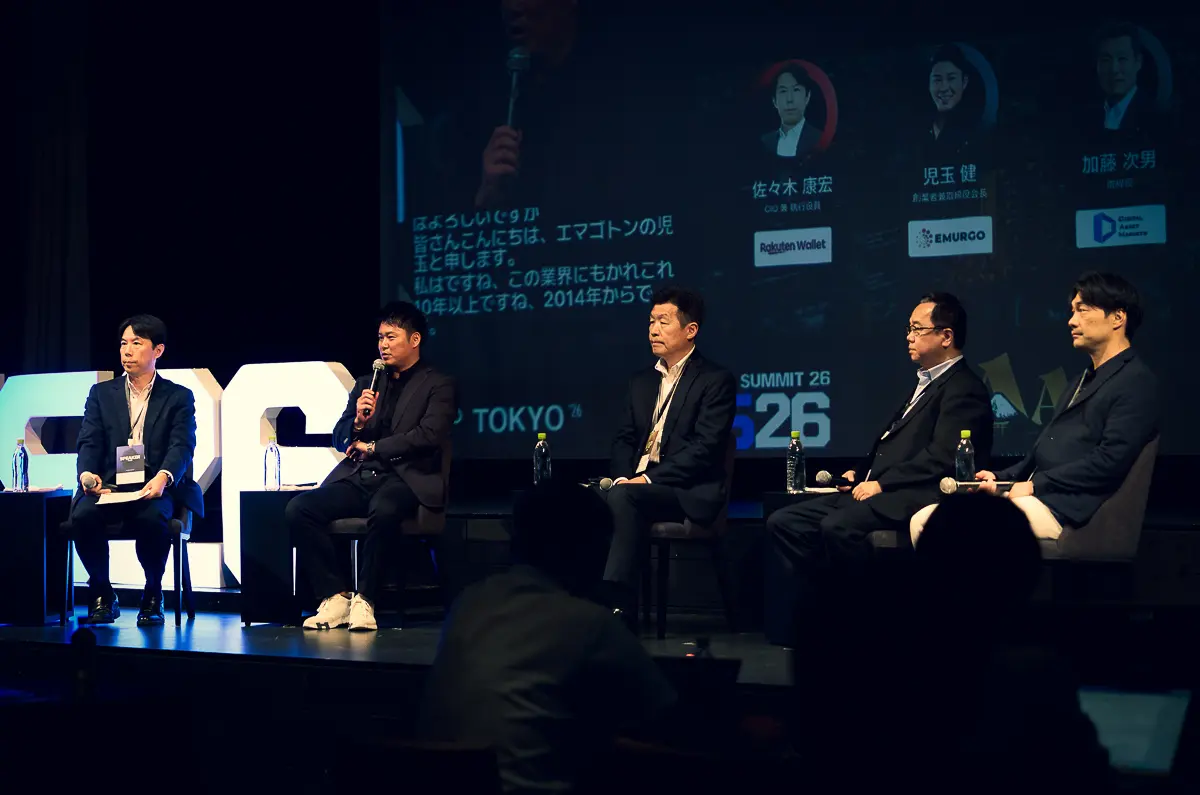 EMURGO Founder & Chairman Ken Kodama / Digital Asset Markets, Inc. Director Tsugio Kato / FINX JCrypto Inc. President & CEO Chen Haiteng / G.U.Group Inc. President & CEO Hidekazu Kondo / Rakuten Wallet, Inc. CIO & Executive Officer Yasuhiro Sasaki (Moderator)