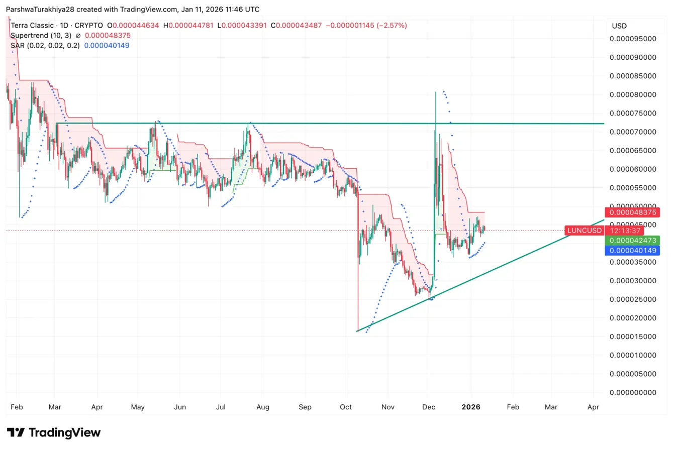 The setup hinges on the Do Kwon trial outcome and whether the rising trendline holds. If LUNC defends $0.000042 and breaks above Supertrend resistance at $0.00004837, the structure shifts bullish. That would target $0.000055 initially, with further upside toward $0.000065 if trial developments prove neutral or positive.