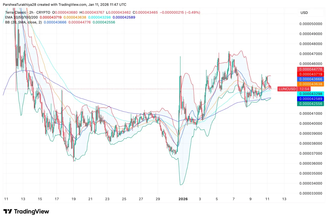 The 2-hour chart shows LUNC consolidating in a tight range as major EMAs converge between $0.00004258 and $0.00004371. Price is trading near the middle of this cluster, showing neither bulls nor bears have control.