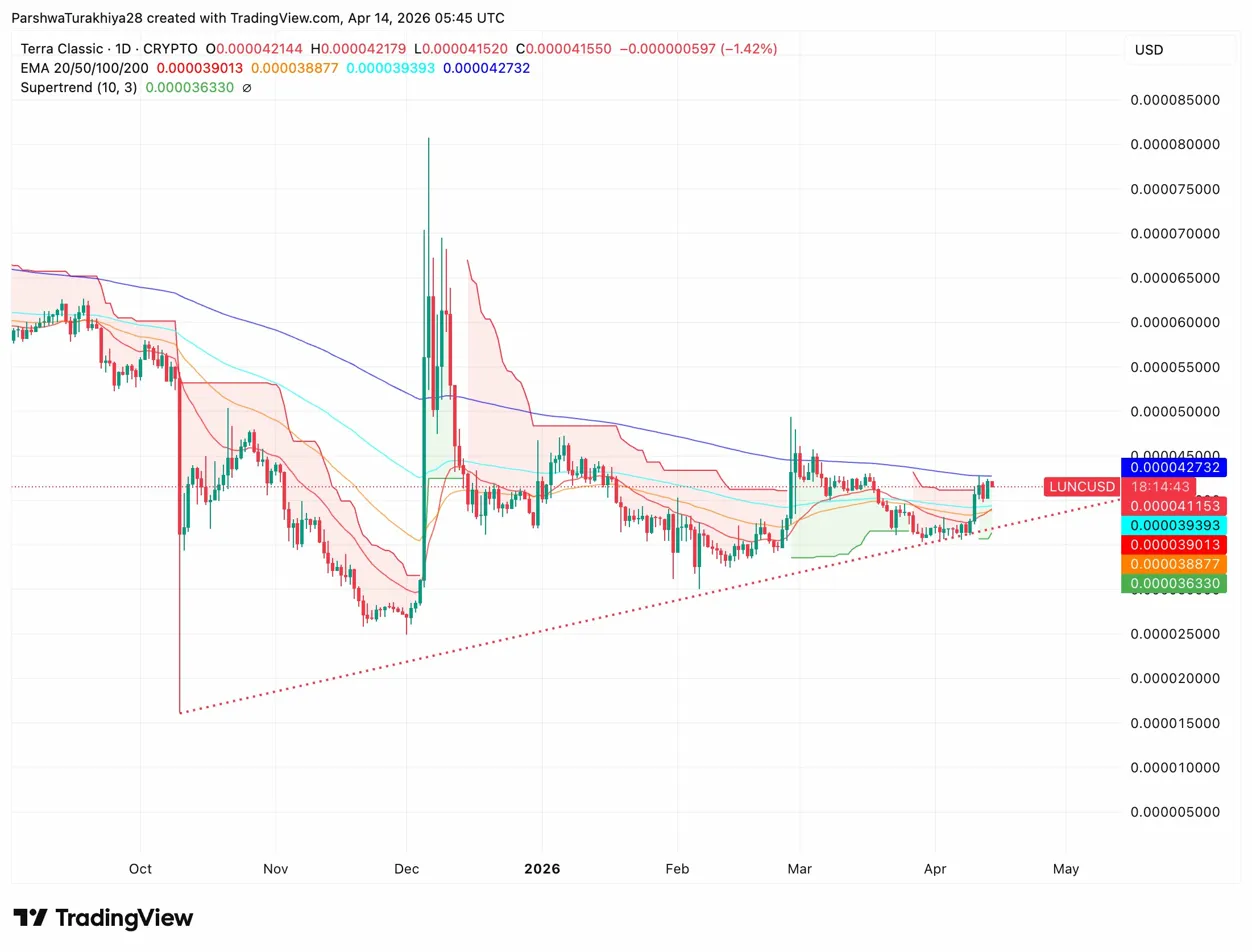 LUNC trades at $0.0000416 on April 14, down 1.42%, sitting above all four EMAs for the first time since October as Upbit announces a withdrawal suspension starting April 17 for a network upgrade.