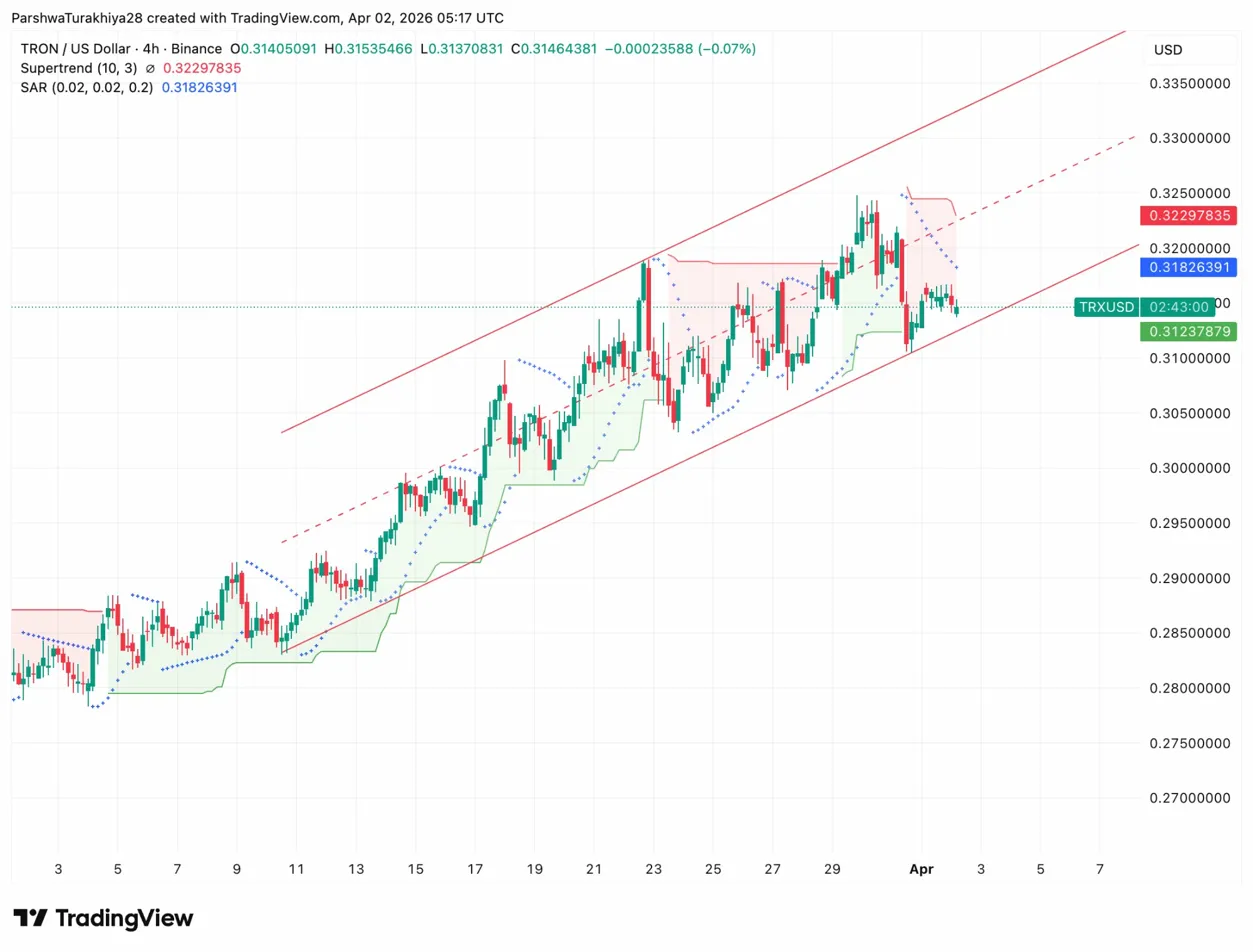 TRX has been building inside a clean ascending channel since March 3, rising from $0.2780 to a high of $0.3250 on March 28 before pulling back to the channel’s midline. The Supertrend at $0.3229 and the SAR at $0.3182 are both sitting above current price and converging toward the channel’s upper boundary, creating a resistance cluster between $0.3182 and $0.3229 that price needs to clear for the uptrend to resume.