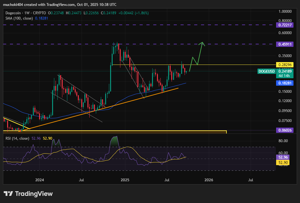 Dogecoin has faced repeated rejections near the $0.28 resistance level across the past three months. The token closed September at $0.23 before rebounding to $0.244, up 6% in 24 hours, per TradingView.