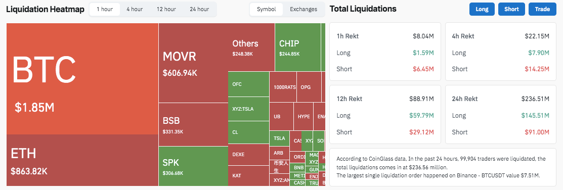 Additionally, crypto markets already show signs of stress. CoinGlass liquidation data over the past 24 hours highlights broad risk unwinding.