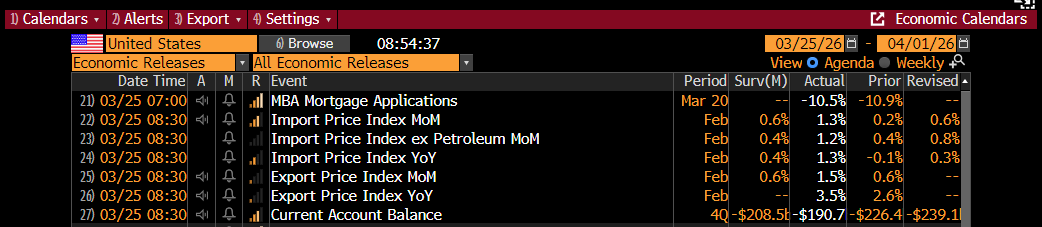 Essentially, the same February data was highlighted by Gordon Johnson on X. He said import prices rose 1.3% against a 0.6% estimate, while export prices rose 1.5% against a 0.6% estimate. He also emphasized that the February reading preceded the oil skyrocketing by a large margin, which keeps the inflation debate active.