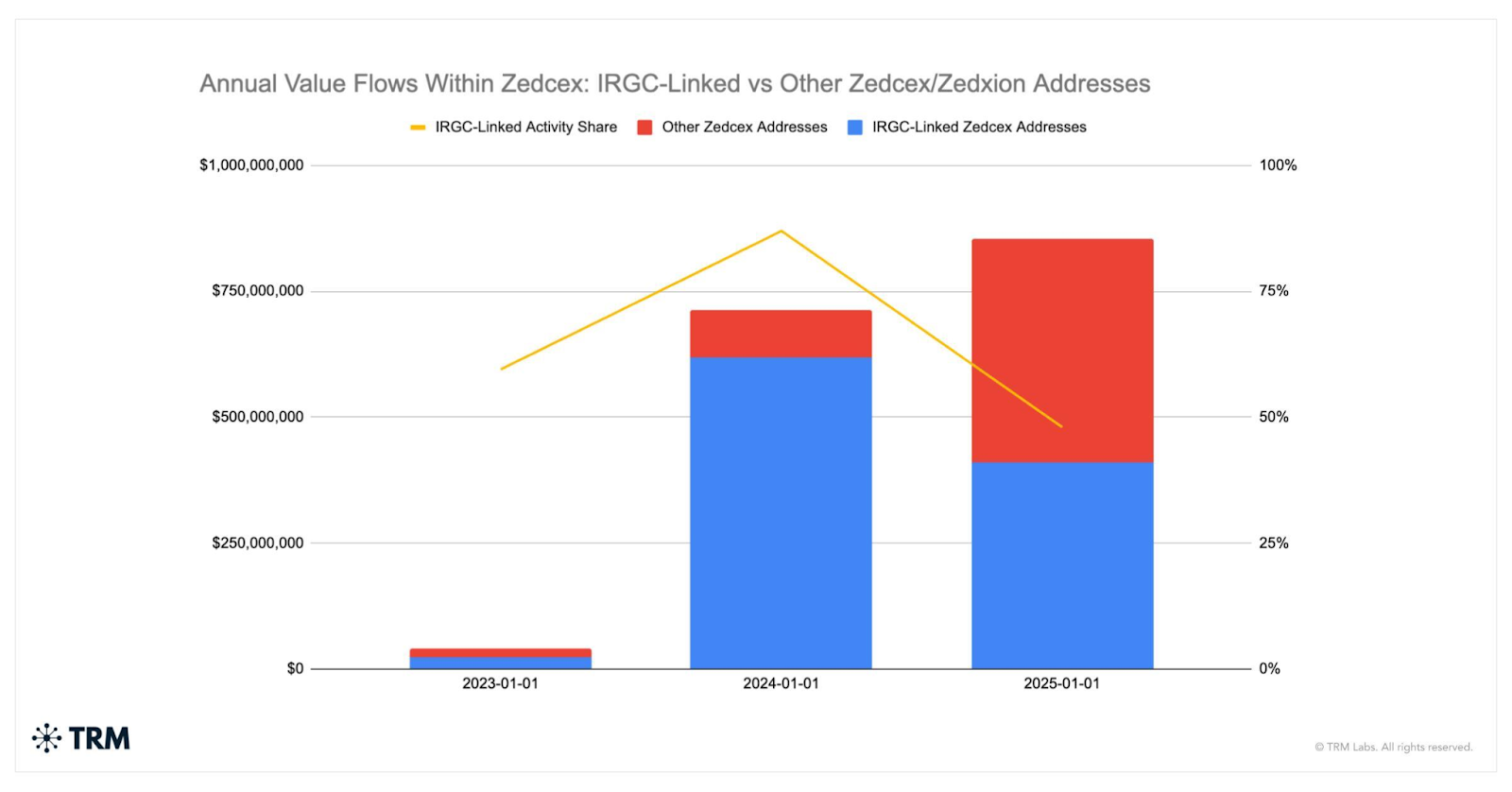 In 2023, approximately $23.7 million flowed through IRGC-linked addresses on the platform, representing around 60% of total activity. By 2024, that figure exploded to $619.1 million, accounting for an estimated 87% of all transactions. In 2025, IRGC-linked flows declined to approximately $410.4 million, though they still represented nearly half of all platform activity.