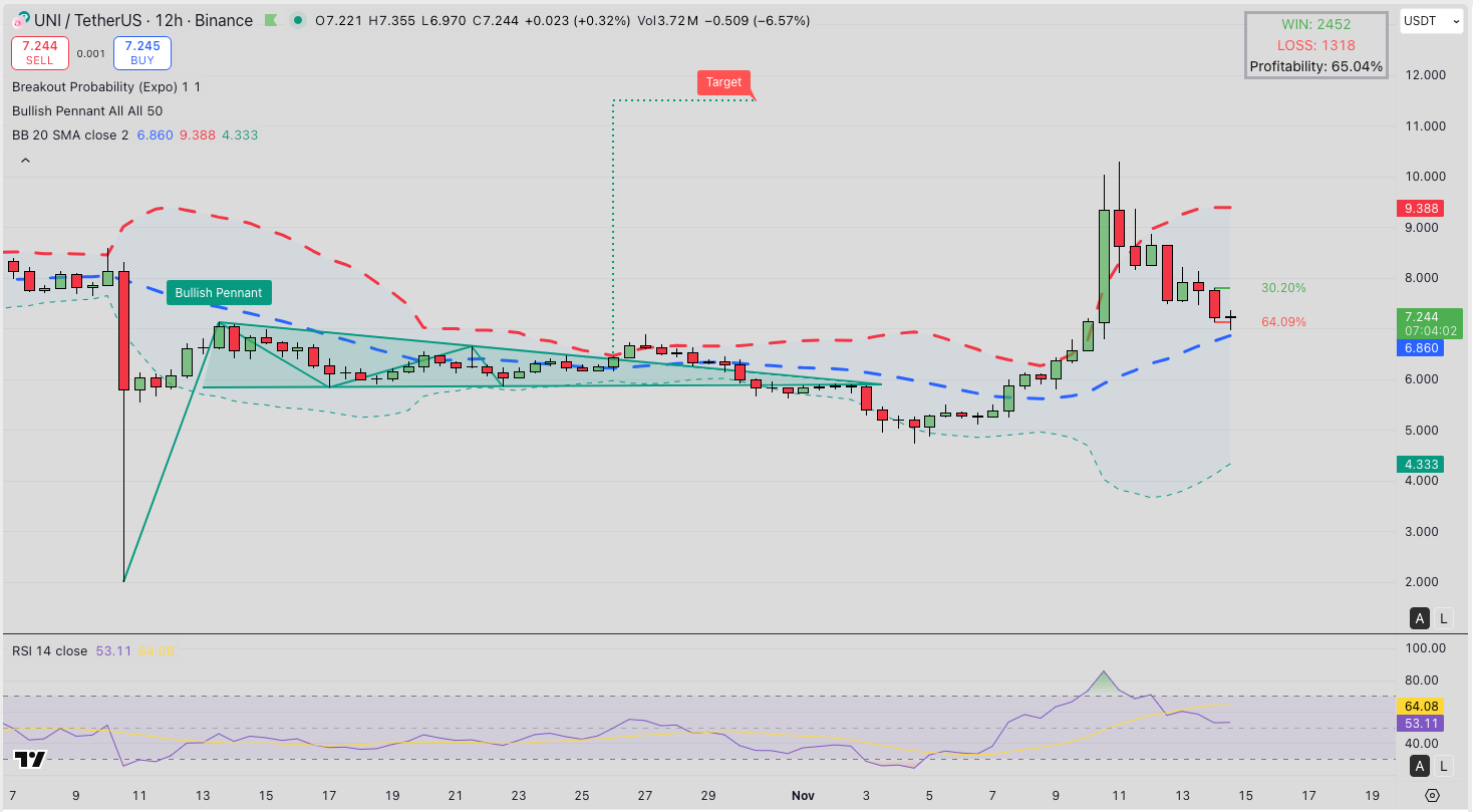 From a price-pattern standpoint, the bullish pennant successfully resolved upward earlier in the month, meeting its measured-move target before the retracement set in. UNI’s ability to continue holding above the $6.80–$7.00 support band is crucial. A sustained close above this level would set UNI up for another attempt at the $8 handle, followed potentially by a retest of the $9.30 resistance.