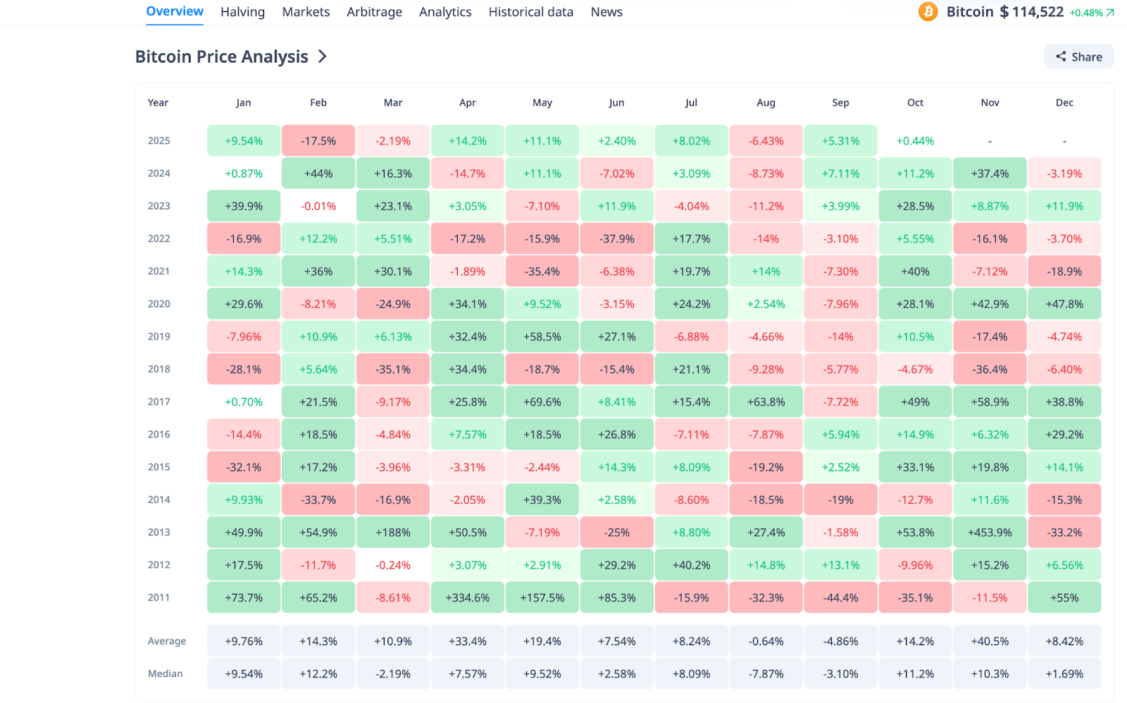 Data from Coinglass shows that October and November are historically the best months for Bitcoin, often producing double-digit returns. For example, November has delivered an average gain of 46% over the past years, making it the strongest month on record.