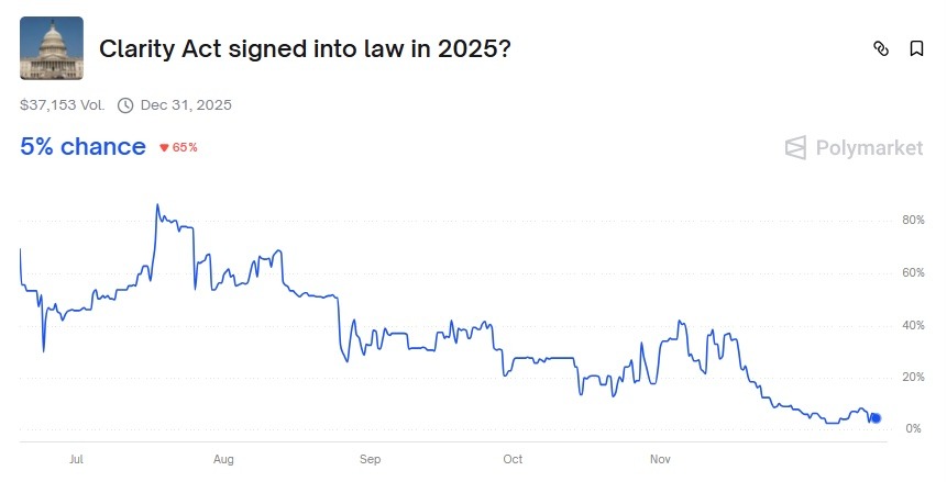 On Polymarket, the chances of the CLARITY Act getting signed into law in 2025 have dropped from over 87% on July 18, to about 5% on December 16.