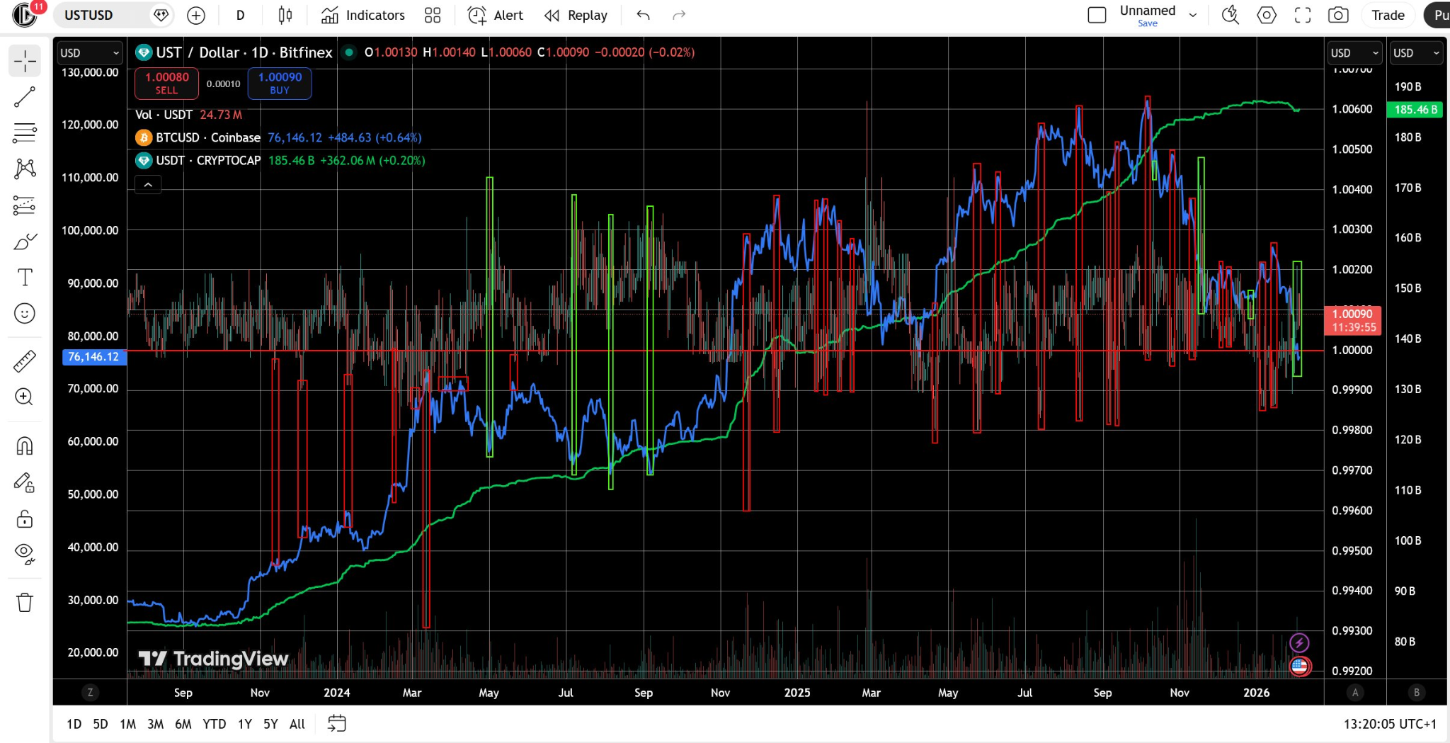The analyst points to March 2024, when a brief USDT depeg was followed by months of sideways trading in Bitcoin, despite strong bullish narratives in the wider market.