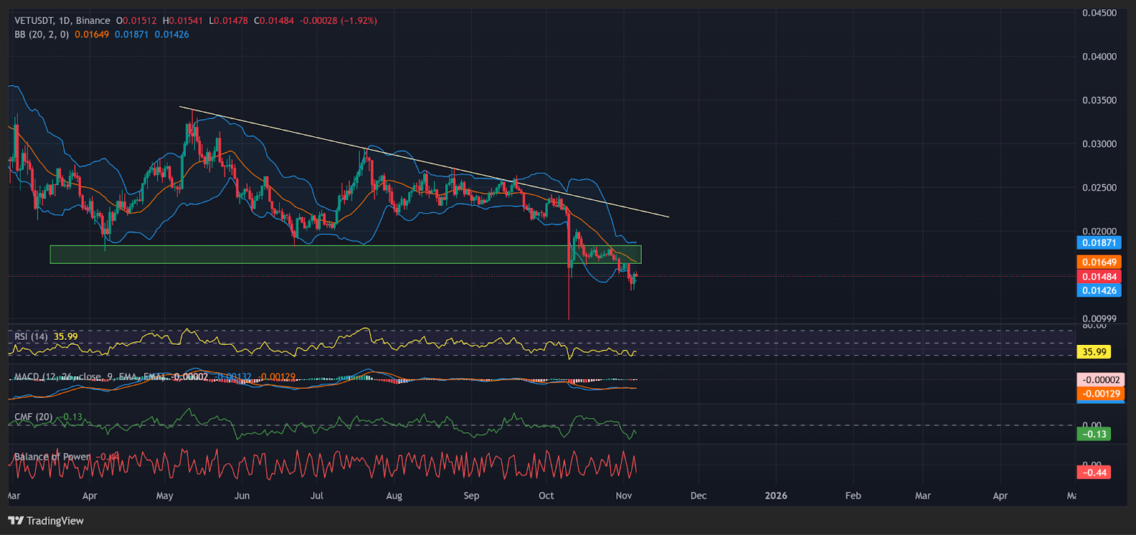 VET’s daily chart shows the token trading below a long-term descending trendline while consolidating just above a critical support zone between $0.0132 and $0.0145. This green area has served as a demand base multiple times throughout 2024.