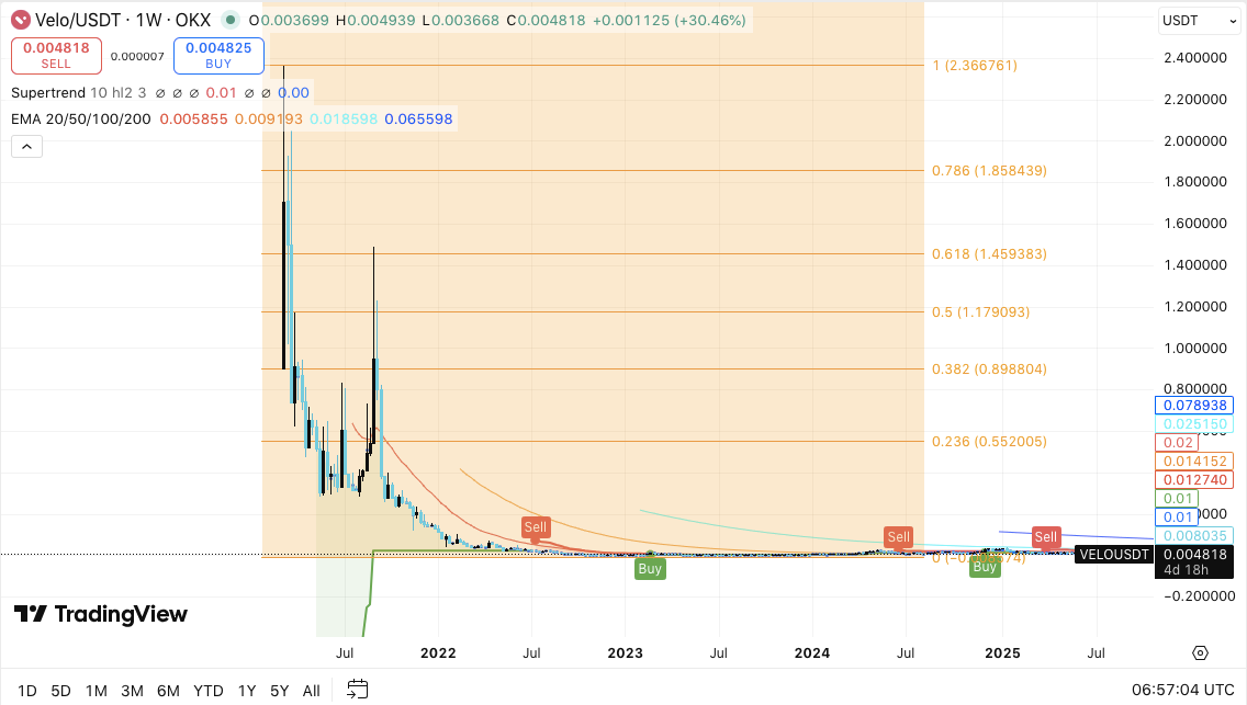 VELO’s long-term chart still reflects a heavy drawdown from its 2021 peak above $2. The price collapsed into a prolonged bottoming phase that lasted through 2023.