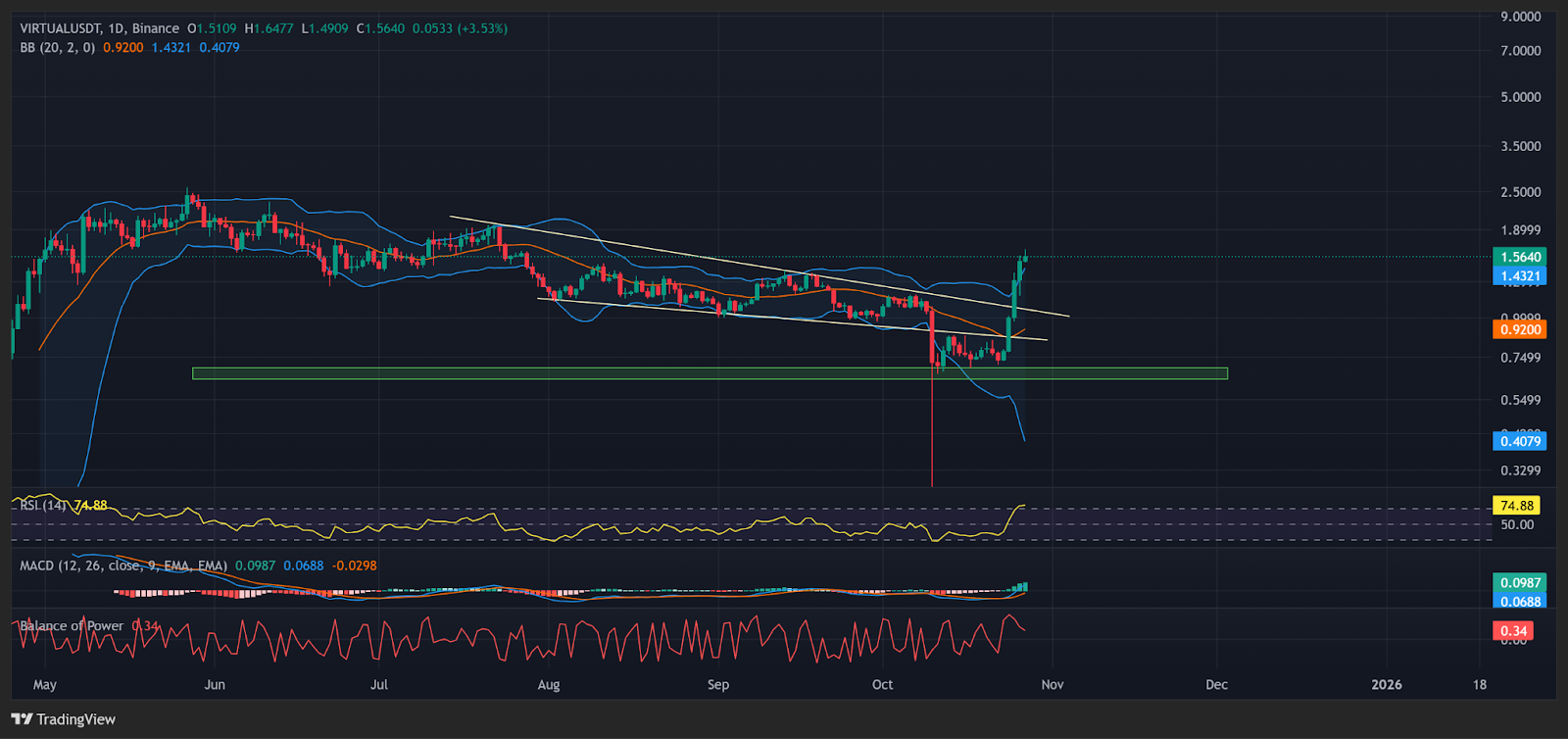 With the bulls currently in control, VIRTUAL could enter a new accumulation phase above $1.50, turning this level into a psychological and technical support. However, failure to hold above $1.43 could invite profit-taking, potentially driving a retest of sub-$1 levels.