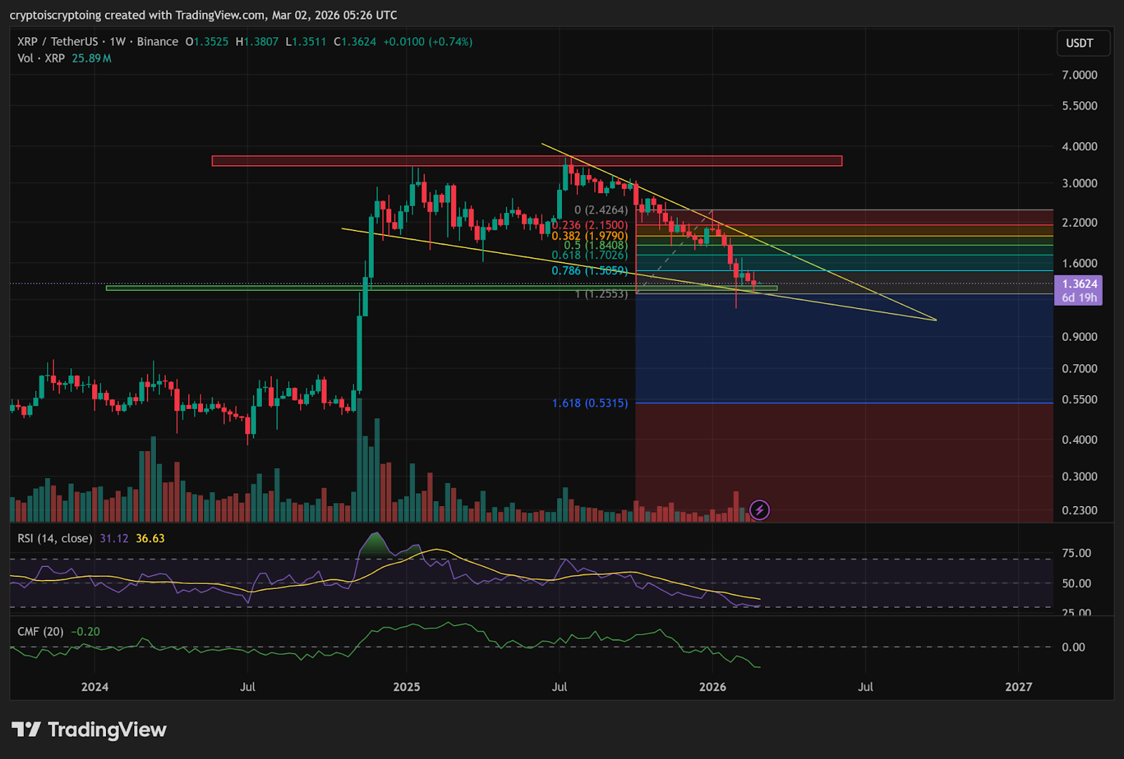 - Fibonacci level 78.6% at $1.50 acts as resistance, with $1.13 acting as the last major support.