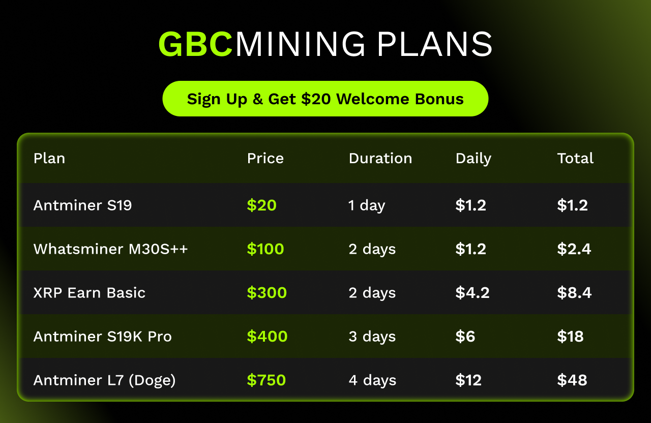 Join GBC Mining today at gbcmining.com and claim your $20 welcome bonus to start mining immediately!