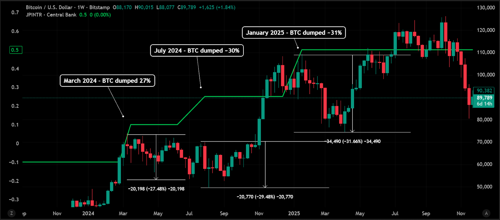 Higher Japanese interest rates often end carry trades that rely on cheap yen borrowing, prompting investors to sell riskier assets such as cryptocurrencies.