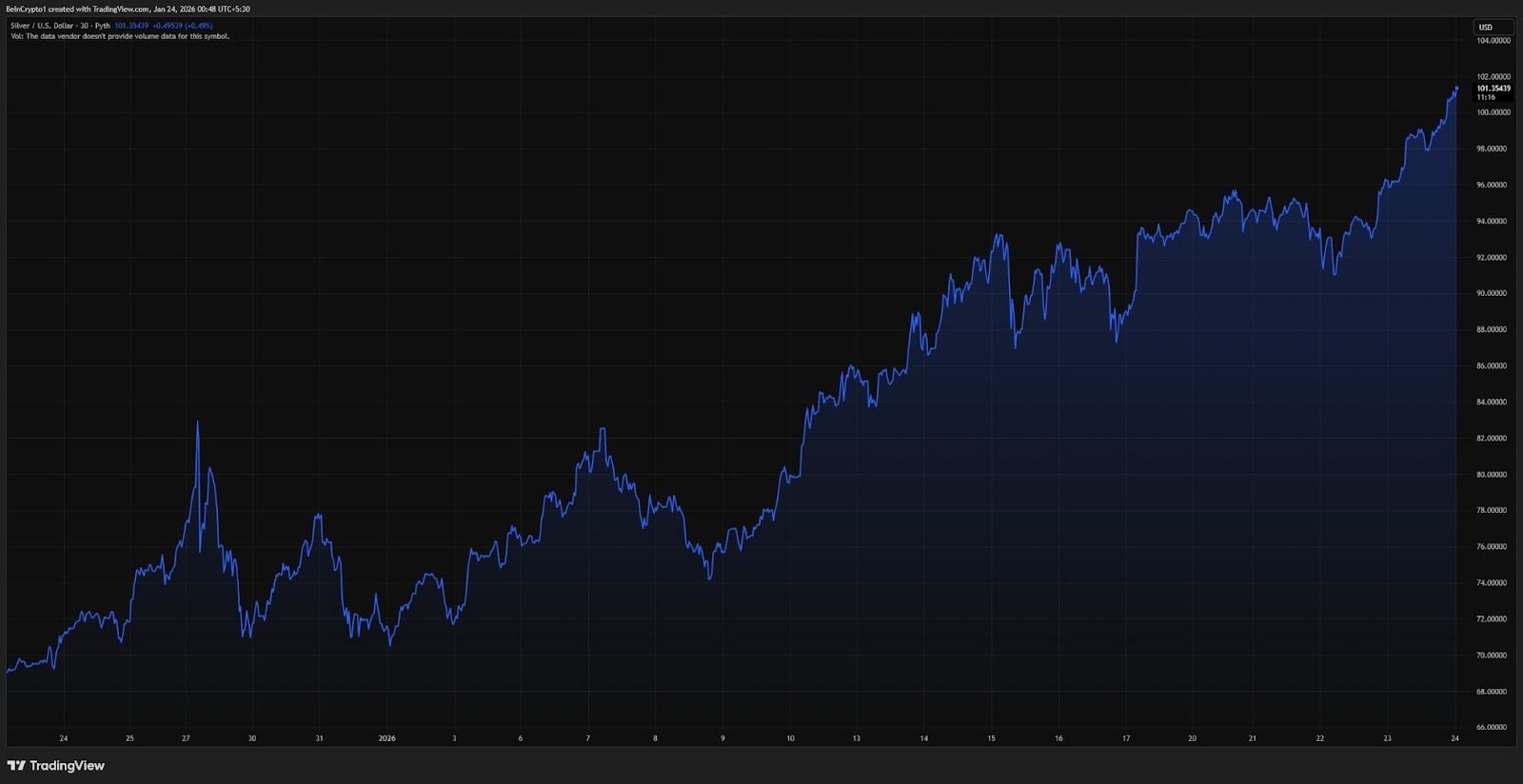 Silver added another signal to the broader macro picture. Prices reached a new all-time high of $101 yesterday, marking months of steady gains followed by a sharp acceleration.